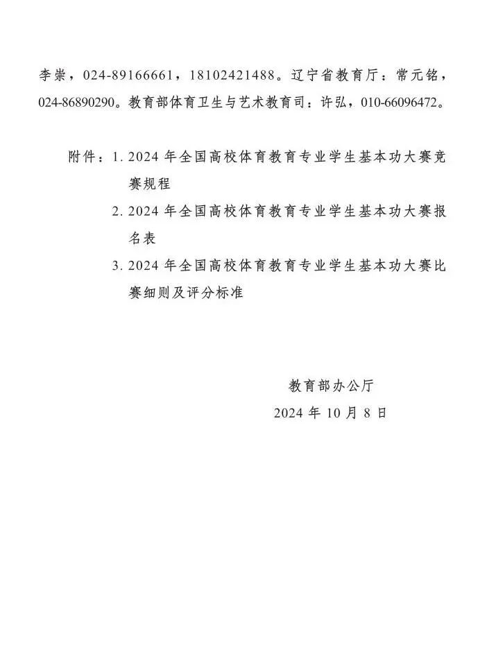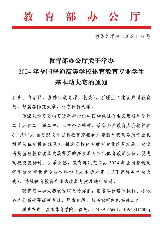 为深入学习贯彻习近平新时代中国特色社会主义思想和党的二十大和二十届二中、三中全会精神,落实全国教育大会精神和《中共中央国务院关于弘扬教育家精神加强新时代高素质专业化教师队伍建设的意见》,推进高校体育教育专业改革发展,建设满足基础教育改革发展需要的高素质专业化体育教师队伍,促进高校交流研讨、互学互鉴,教育部决定举办2024年全国普通高等学校体育教育专业本科学生基本功大赛。