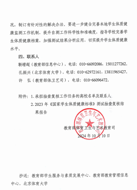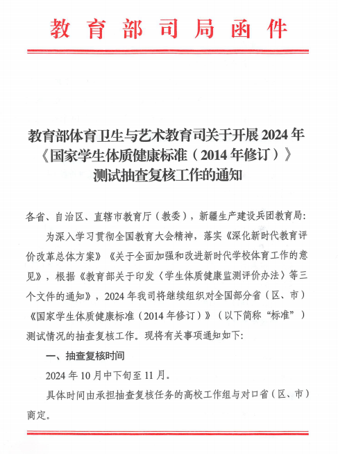 根据《教育部体育卫生与艺术教育司关于开展2024<国家学生体质健康标准(2014年修订)>测试抽查复核工作的通知》,明确在10月中下旬至11月对天津、河北、黑龙江等10个省(区、市)《国家学生体质健康标准(2014年修订)》测试情况进行抽查复核工作。其中,由吉林农业大学对口负责黑龙江省72所学校17760名学生的测试抽查复核工作。