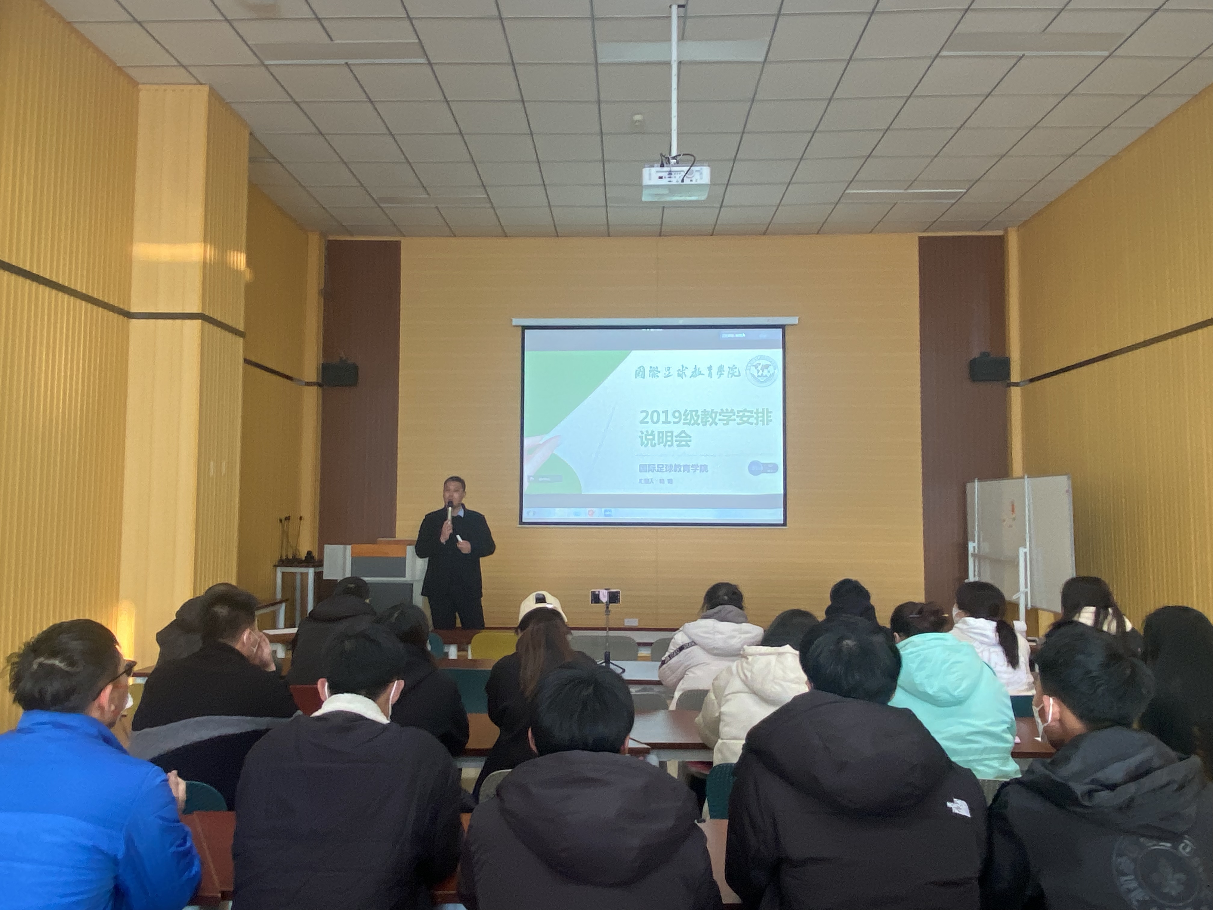 体育教育系主任陆阳针对不同年级的教学安排,足球裁判员、教练员等级考试,尤其是2019级教学实习培训和相关安排等情况进行了详细讲解。