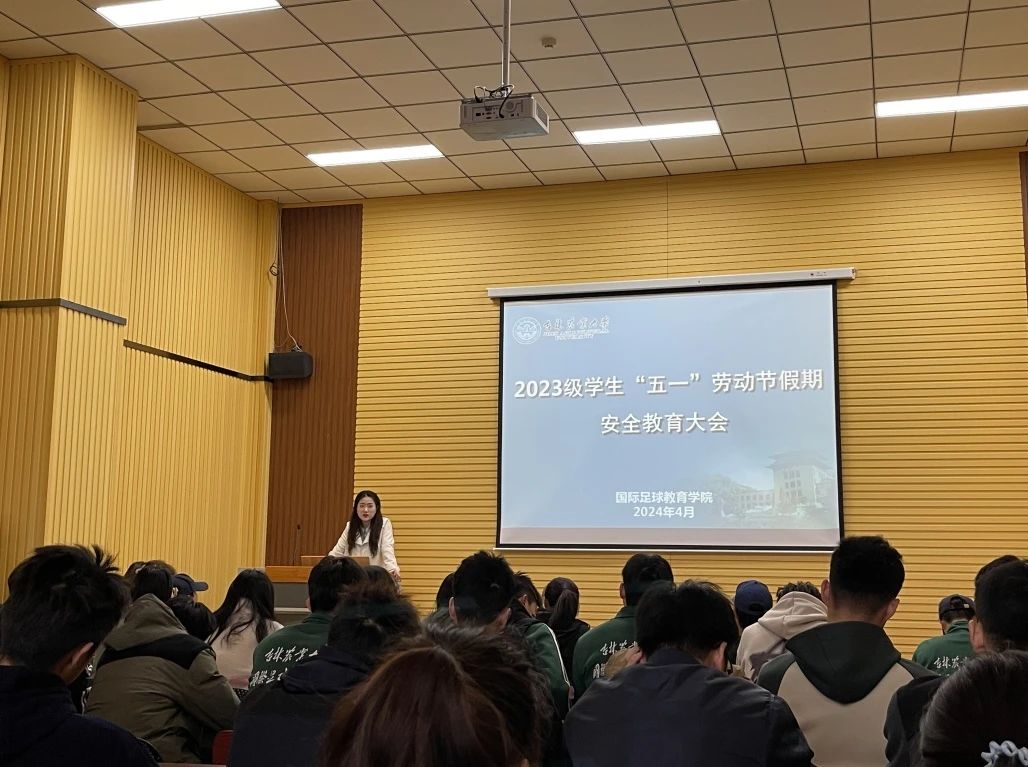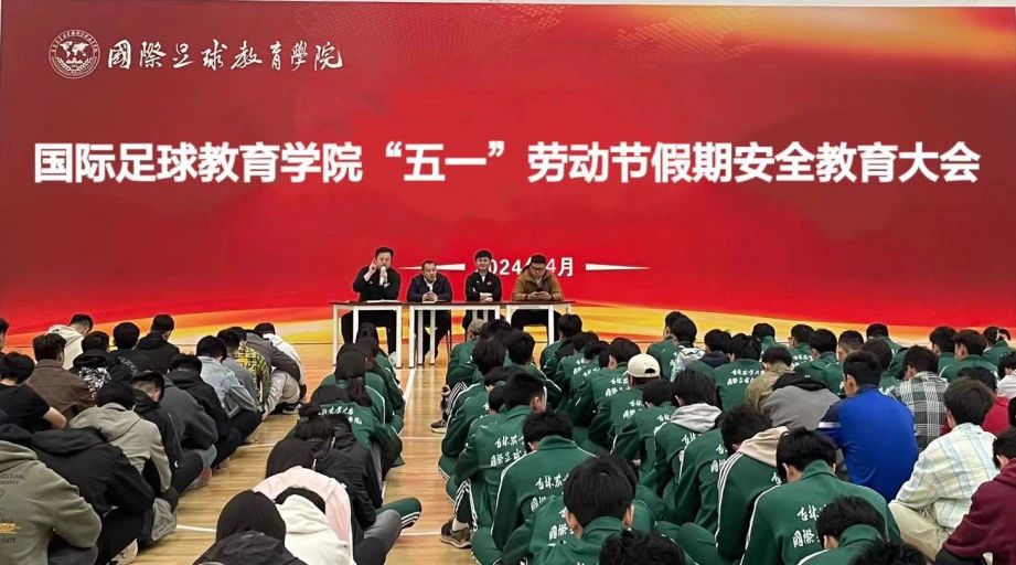 为加强学生节假日安全意识,4月24日,国际足球教育学院召开了“五一”劳动节假期学生安全教育大会。本次会议由学工办副主任梅雪峰主持,学院党总支副书记赵立刚、各年级辅导员及全体学生参加会议。