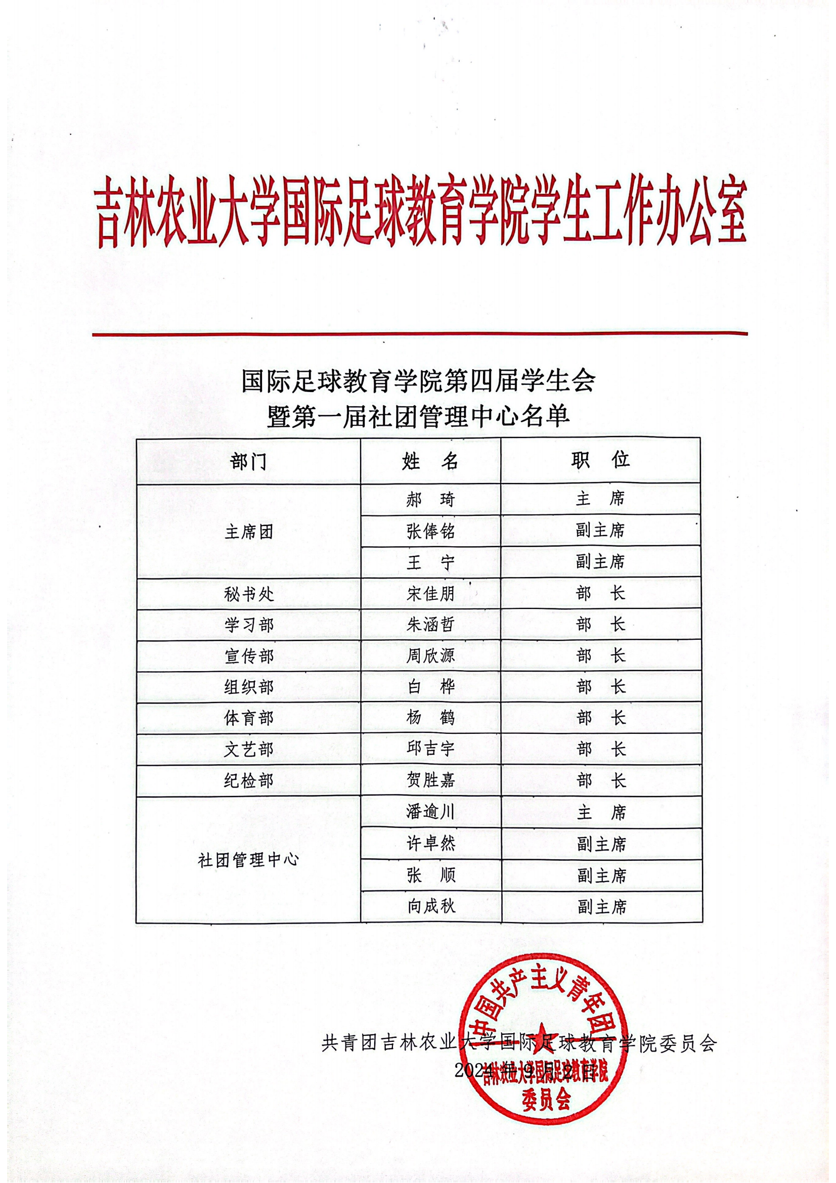 国际足球教育学院第四届学生会暨第一届社团管理中心名单