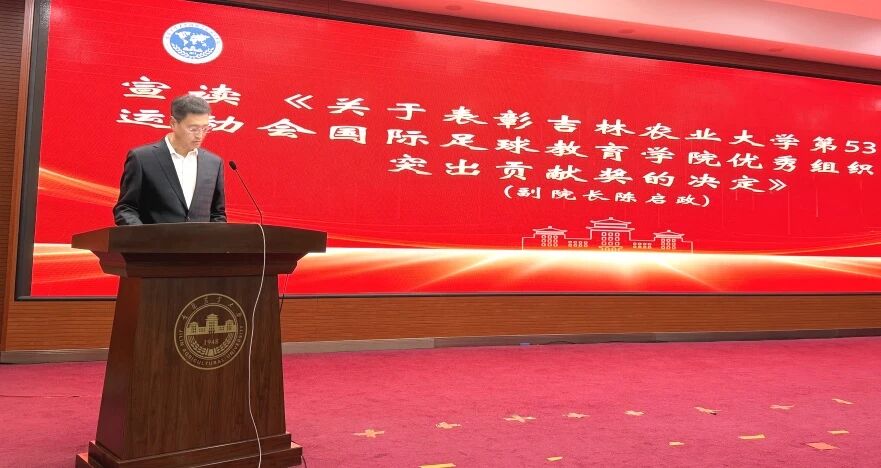 第三项:副院长陈启政宣读《关于表彰吉林农业大学第53届田径运动会国际足球教育学院优秀组织奖、突出贡献奖的决定》