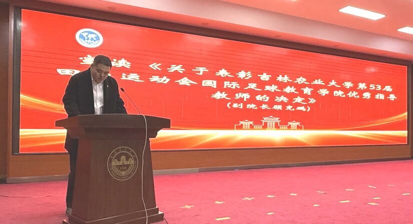 第二项:副院长顾克鹏宣读《关于表彰吉林农业大学第53届田径运动会国际足球教育学院优秀指导教师的决定》