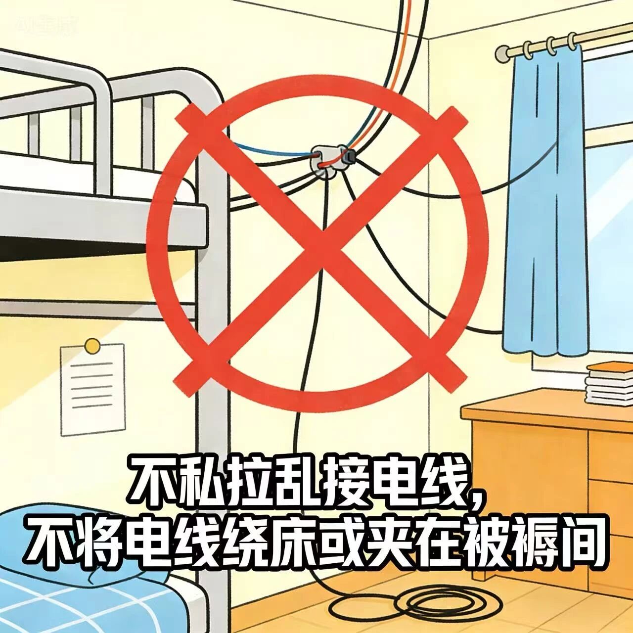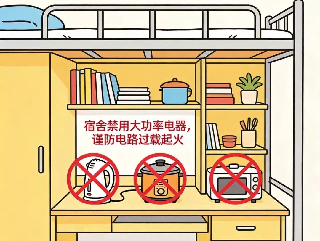 2.规范用电不违规:寝室严禁私拉乱接电线,所有电线与插线板需远离易燃物,禁止缠绕在金属床架或栏杆上;同时要选用合格插线板,严禁超负荷使用大功率电器。离开时务必断电,发现隐患及时报修。安全用电,人人有责!