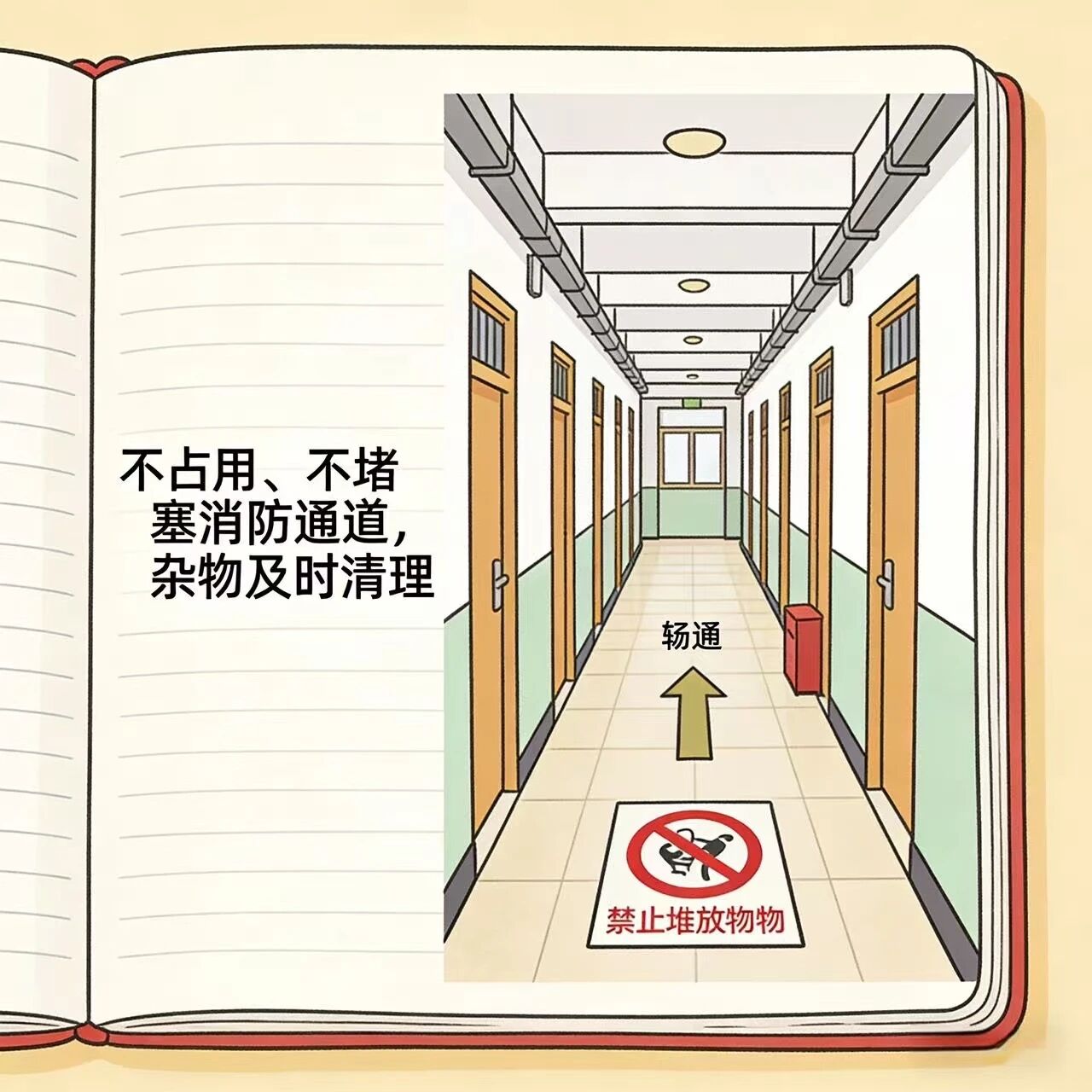 1.根据消防安全要求,寝室楼道、楼梯间及消防通道为紧急疏散的“生命通道”,严禁堆放任何杂物、个人物品(包括鞋架、纸箱等),须确保24小时畅通无阻,共同维护宿舍安全。