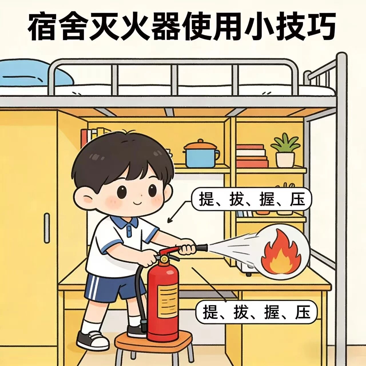 1. 严控易燃易爆品:严禁在寝室内存放汽油、酒精、烟花爆竹等易燃易爆物品;严禁在寝室使用直板夹、电锅等大功率电器;使用花露水、杀虫剂等含易燃成分的日用品时,远离火源、热源,避免密闭空间大量喷洒。