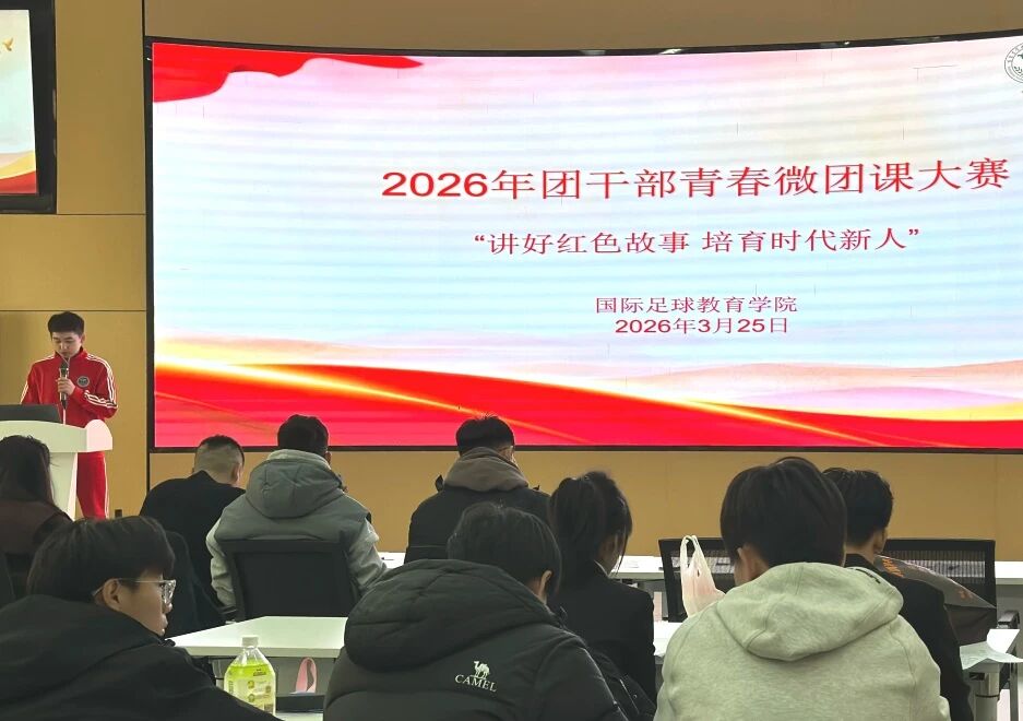 为深入学习宣传贯彻党的创新理论,全面加强青年思想政治引领,筑牢青年理想信念根基,3月25日,国际足球教育学院在红烛报告厅举办“讲好红色故事,培育时代新人”2026年团干部青春微团课大赛。学院全体学生工作人员及部分大一、大二学生参加活动。