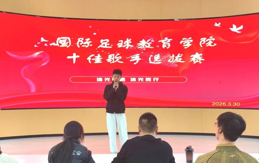 为丰富校园文化生活,强化美育育人实效,发掘优秀青年文艺人才,3月30日,国际足球教育学院在红烛报告厅举办 “唱响青春·声动校园” 十佳歌手选拔赛,现场选拔优秀学子代表学院参加2026年吉林农业大学校园歌手大赛。学院全体学生工作人员及各年级学生代表参加活动。