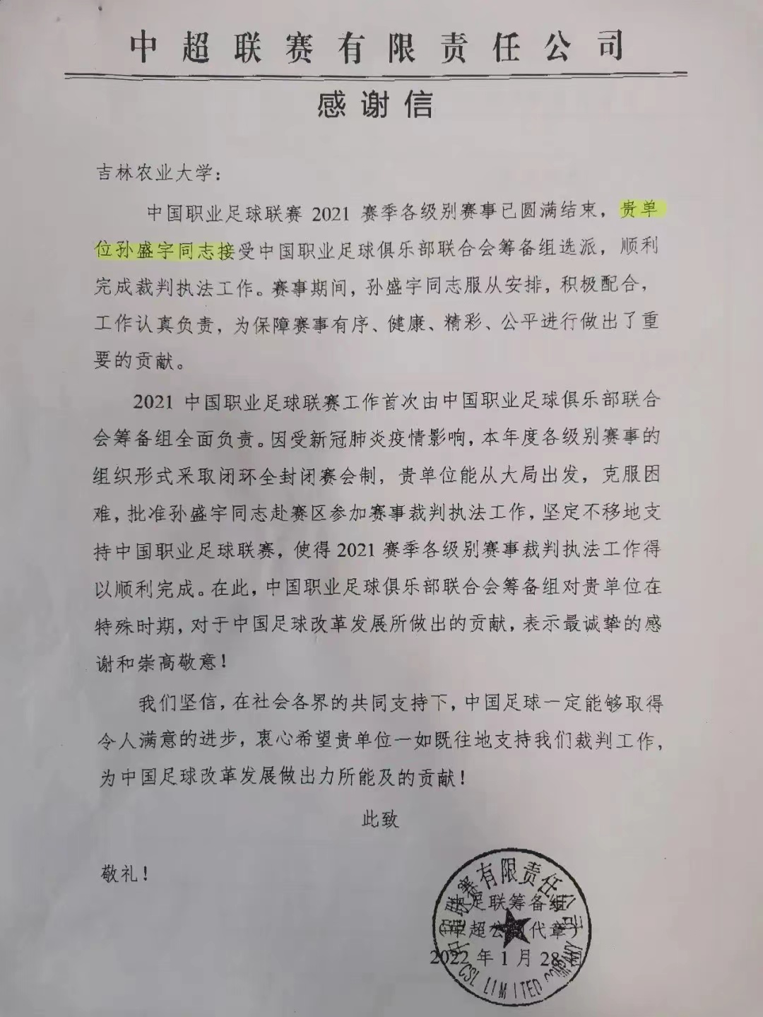 日前,中超联赛有限责任公司向学校发来《感谢信》,对我院孙盛宇老师在中国职业足球联赛2021赛季裁判执法工作中的优异表现给予高度评价,并对我校在特殊时期对中国职业足球联赛给予的大力支持表示感谢和敬意。