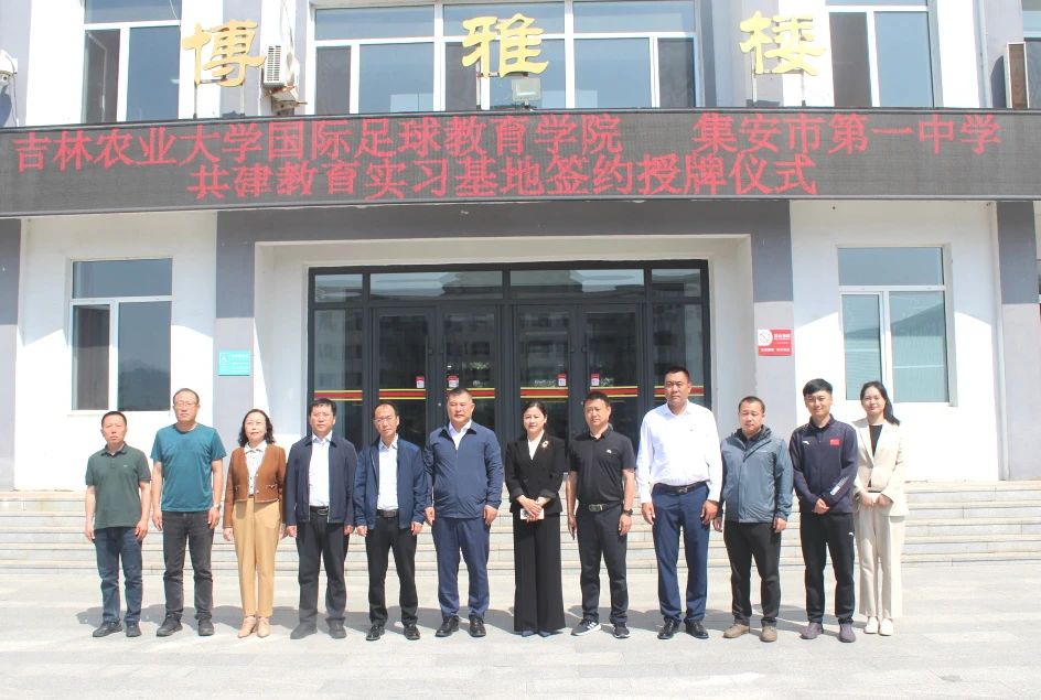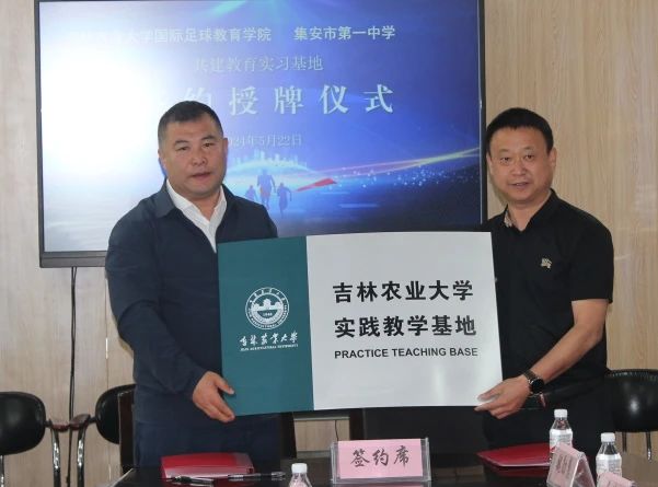5月22日上午,吉林农业大学国际足球教育学院与集安市第一中学举行共建实践教学基地签约授牌仪式。集安市委副书记王伟人、集安市副市长邵帅、集安市教育局局长刘玉臣、集安市第一中学校长宋继伟、国际足球教育学院院长张志成、副院长顾克鹏、副书记赵立刚及相关教师参加了此次签约仪式。签约仪式由集安市第一中学副校长祝培君主持。
