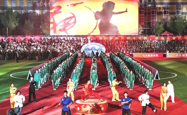 开幕式上的文体表演精彩纷呈:千人团体操气势恢宏,伞操与健美队刚柔并济,歌曲《相亲相爱一家人》温情收尾,璀璨礼花划破秋日夜空,将现场气氛一次次推向高潮,共同铸就了农大之夜难忘的记忆。精彩纷呈的文体表演不仅展现了学子多才多艺、全面发展的精神风貌,也传递出“文体融合、育人于心”的教育理念。