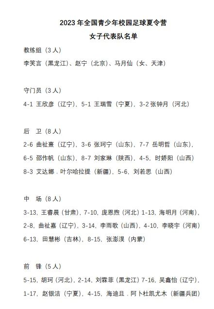 吉林省由吉林农业大学国际足球教育学院任广泉担任领队,李成国担任男子组教练员,范超担任女子组教练员,他们带领初中组八男八女参加2023年全国青少年校园足球夏令营。初中男子组队员有:吕丞玄、曹裕敏、卢帅豪、高梓惟、朴恩浩、张宰赫、李承原、杨涵博;初中女子组队员有:黄雅婷、叶雨欣、李欣怡、桂语晨、于芳茜、李岳谦、王萌、田慧彬。