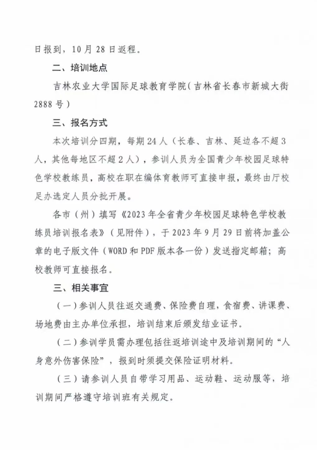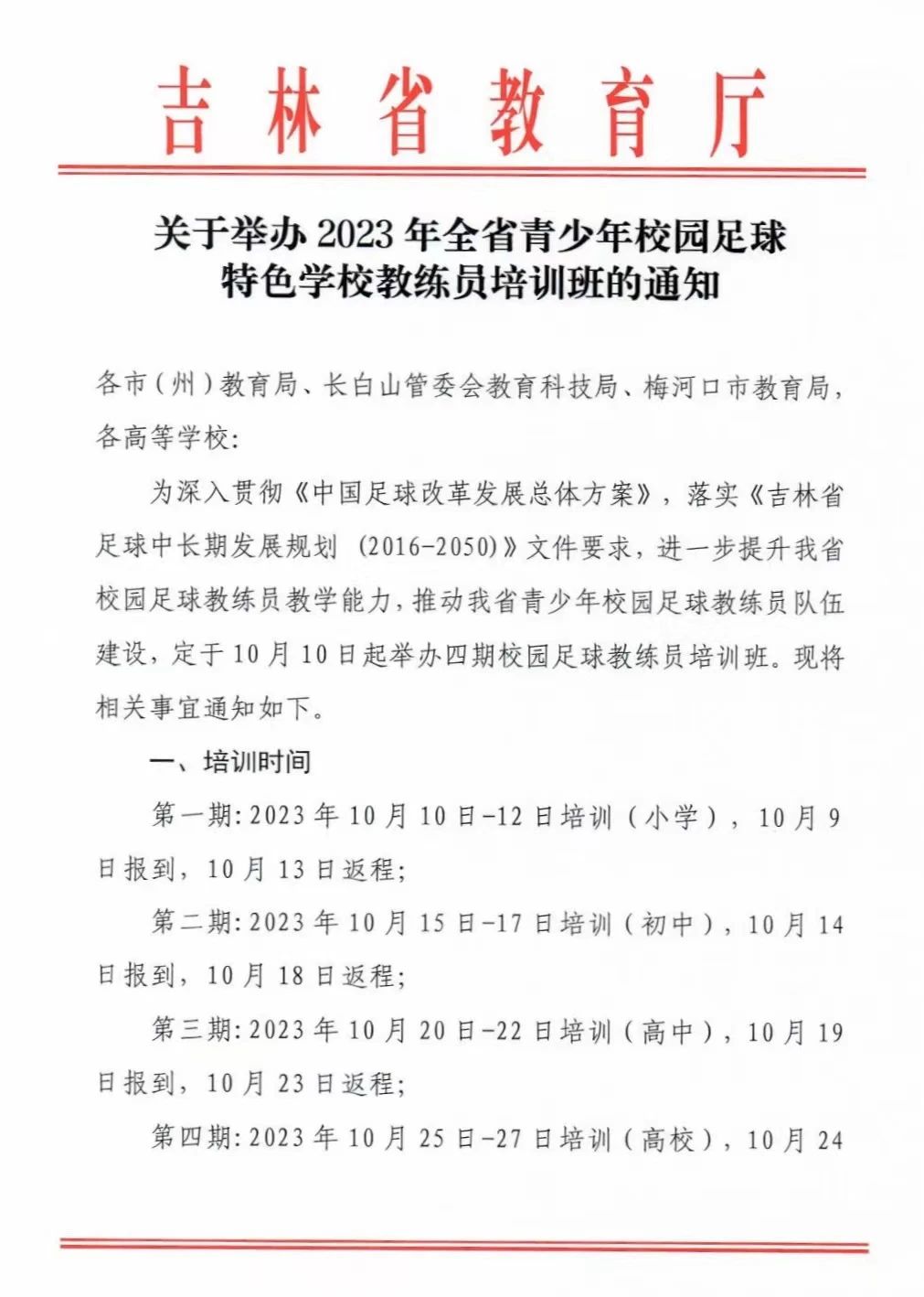 按照吉林省教育厅工作安排,为深入贯彻《中国足球改革发展总体方案》,落实《吉林省足球中长期发展规划(2016-2050)》文件要求,进一步提升我省校园足球教练员教学能力,推动我省青少年校园足球教练员队伍建设,10月10日,国际足球教育学院举办了2023年全省青少年校园足球特色学校教练员第一期培训班(小学)。