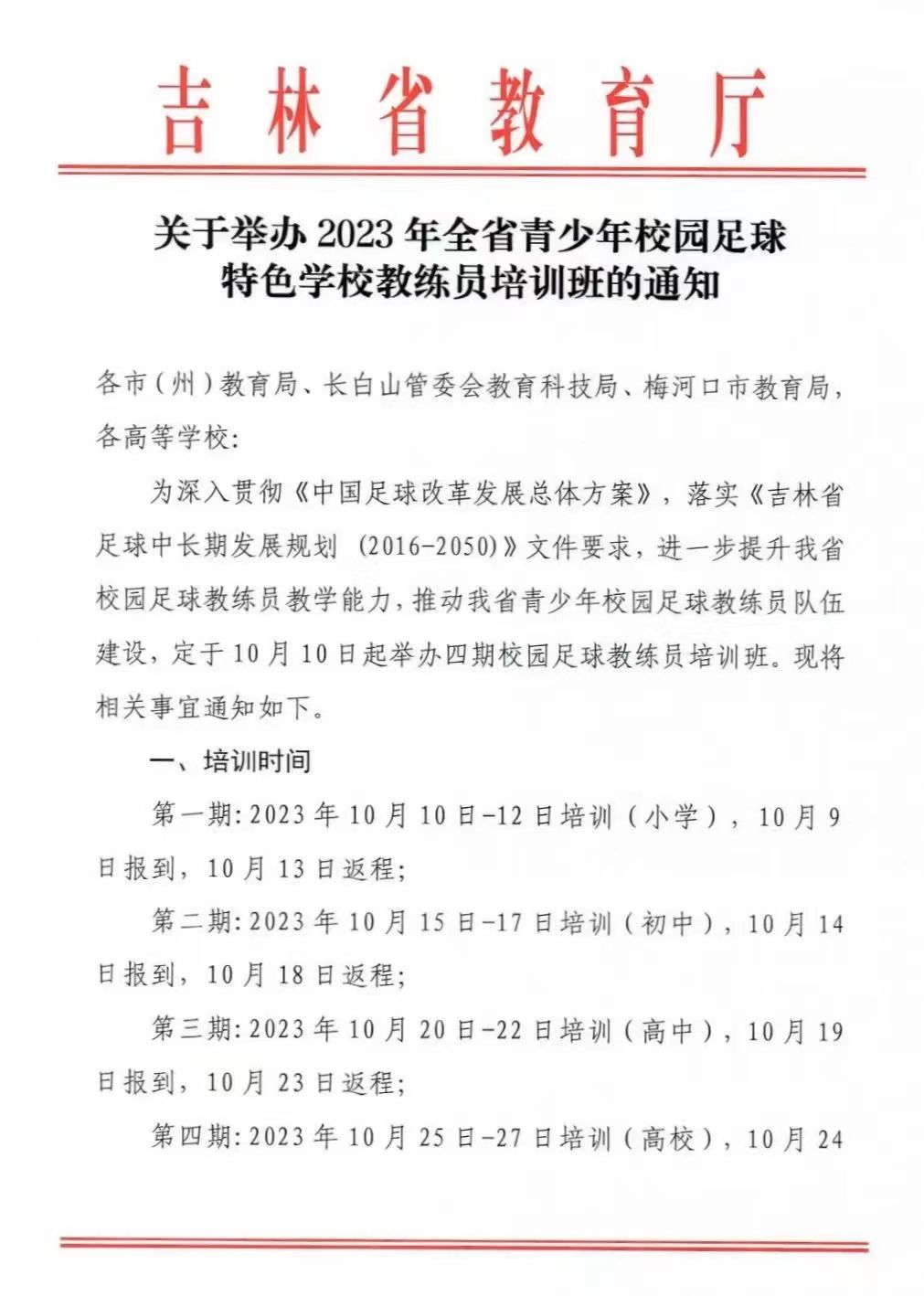 为深入贯彻《中国足球改革发展总体方案》,落实《吉林省足球中长期发展规划(2016-2050)》文件要求,进一步提升我省校园足球教练员教学能力,推动我省青少年校园足球教练员队伍建设,按照吉林省教育厅工作安排,1025日,国际足球教育学院举办了2023年全省青少年校园足球特色学校教练员第四期培训班(高校)。