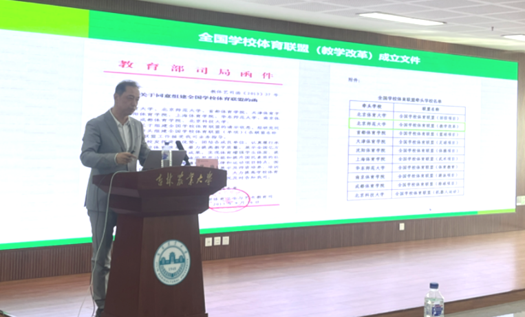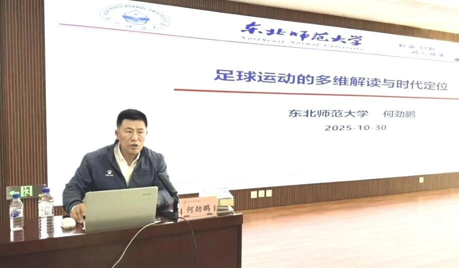 东北师范大学何劲鹏教授开展了以足球运动的多维解读与时代定位为主题的专题讲座。何教授指出,新时代足球是社会活力的重要载体,通过群体参与可以凝聚民族精神、促进公众健康。