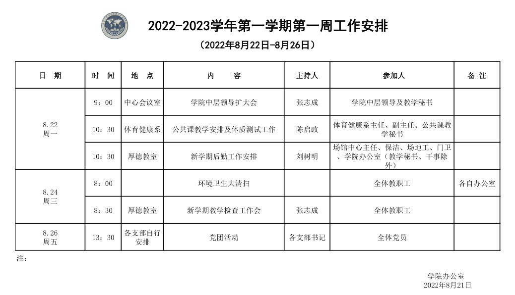 2022-2023学年第一学期第一周工作安排