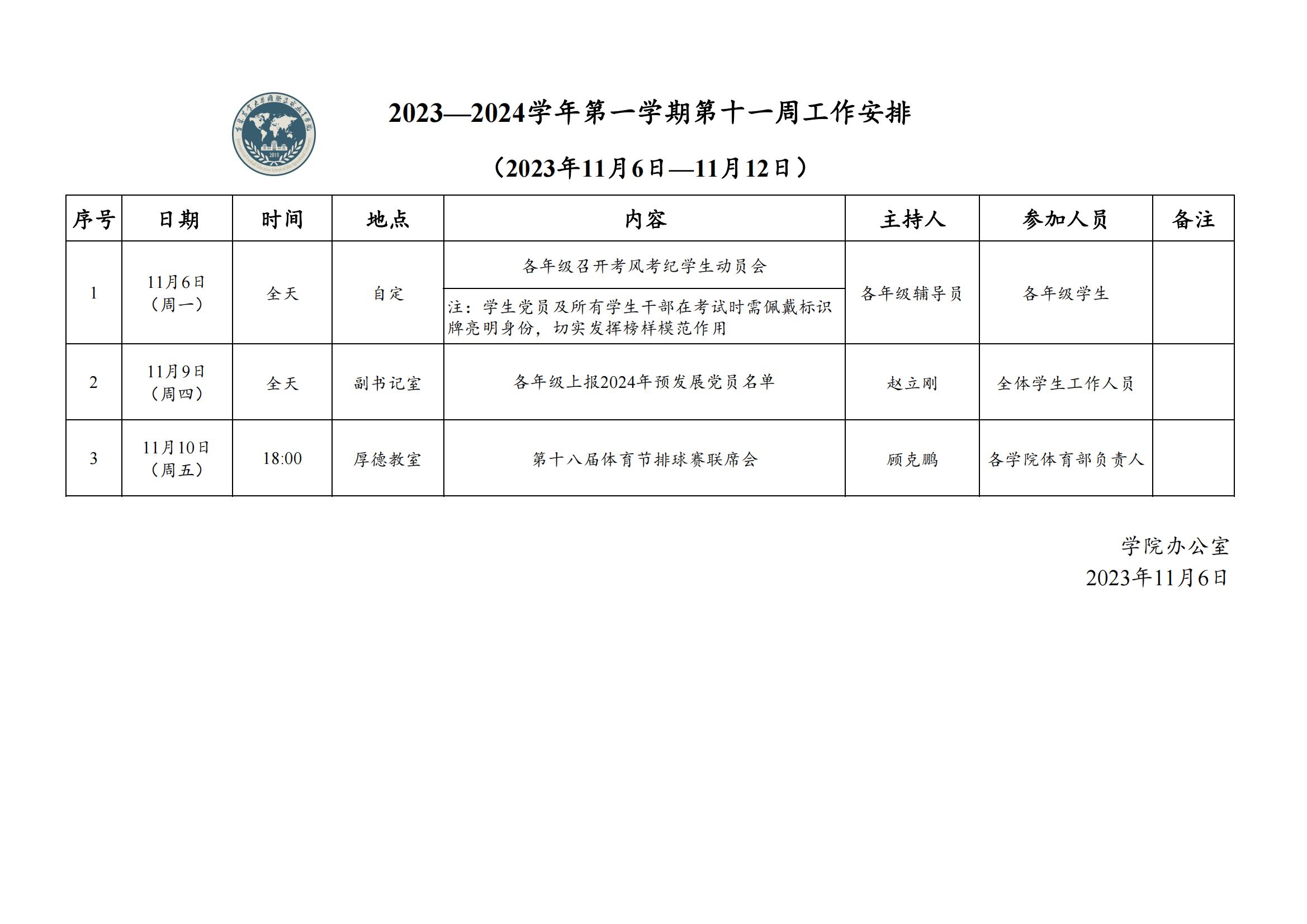 2023-2024学年第一学期第十一周工作安排