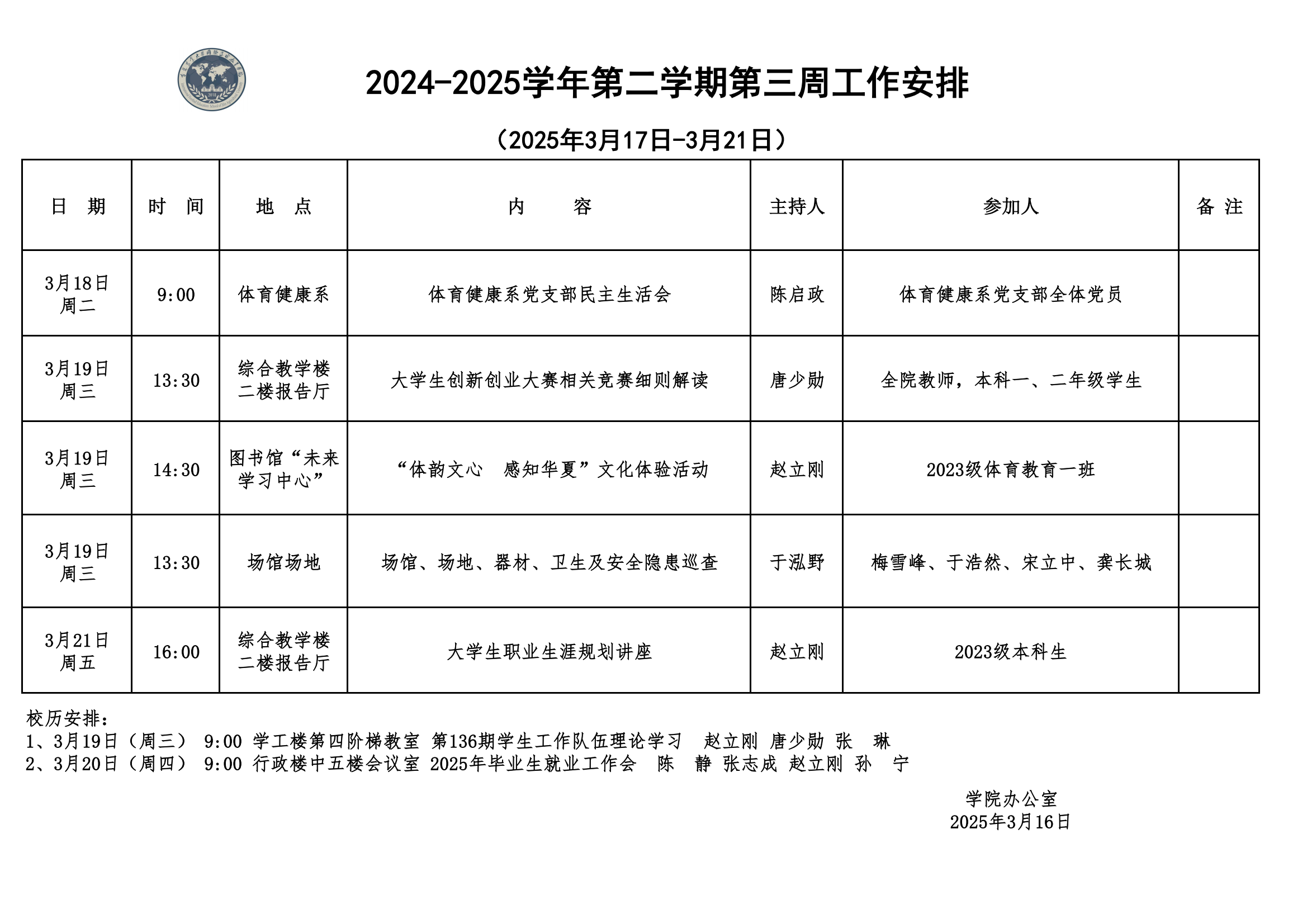 2024-2025学年第二学期第三周工作安排