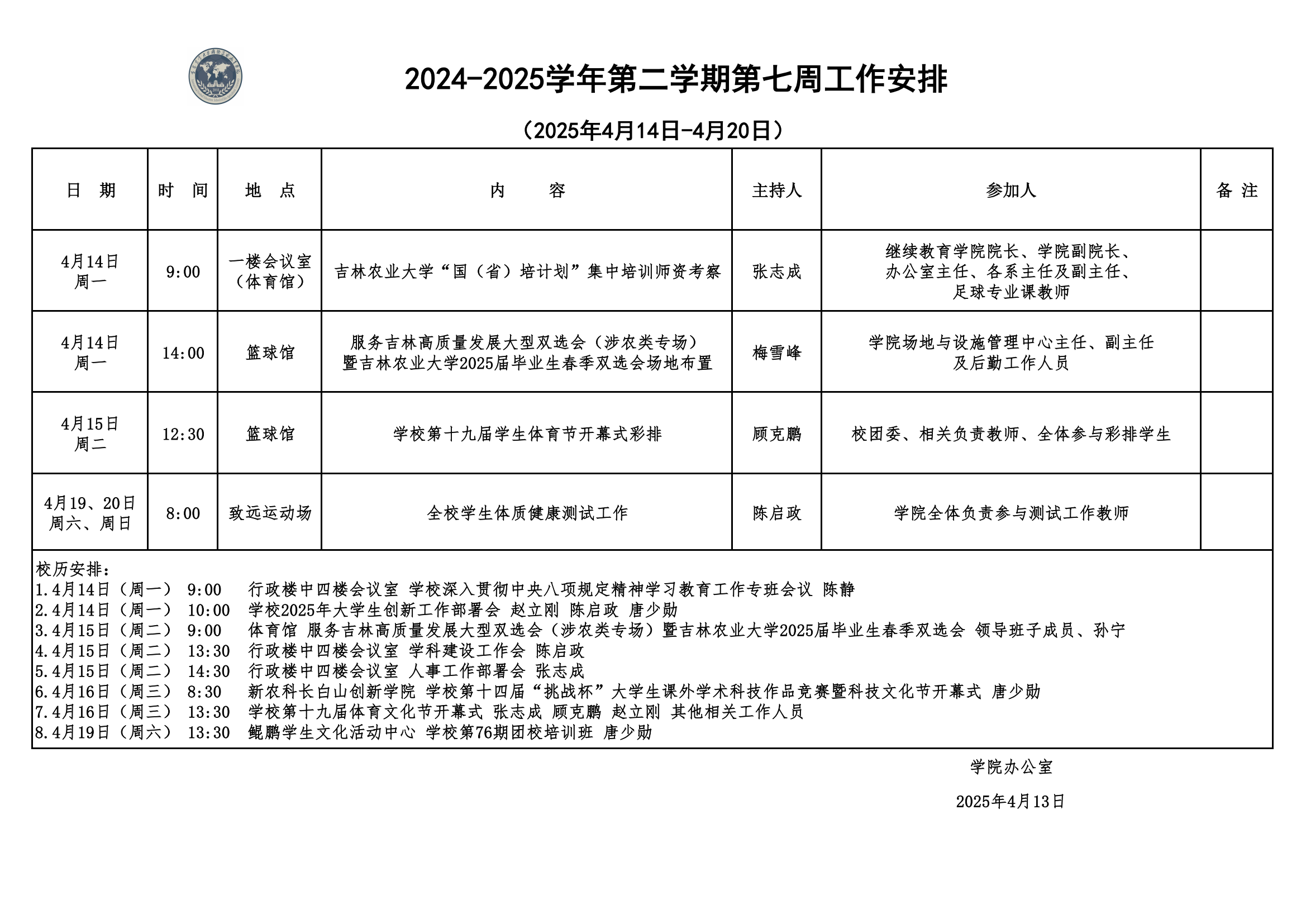 2024-2025学年第二学期第七周工作安排
