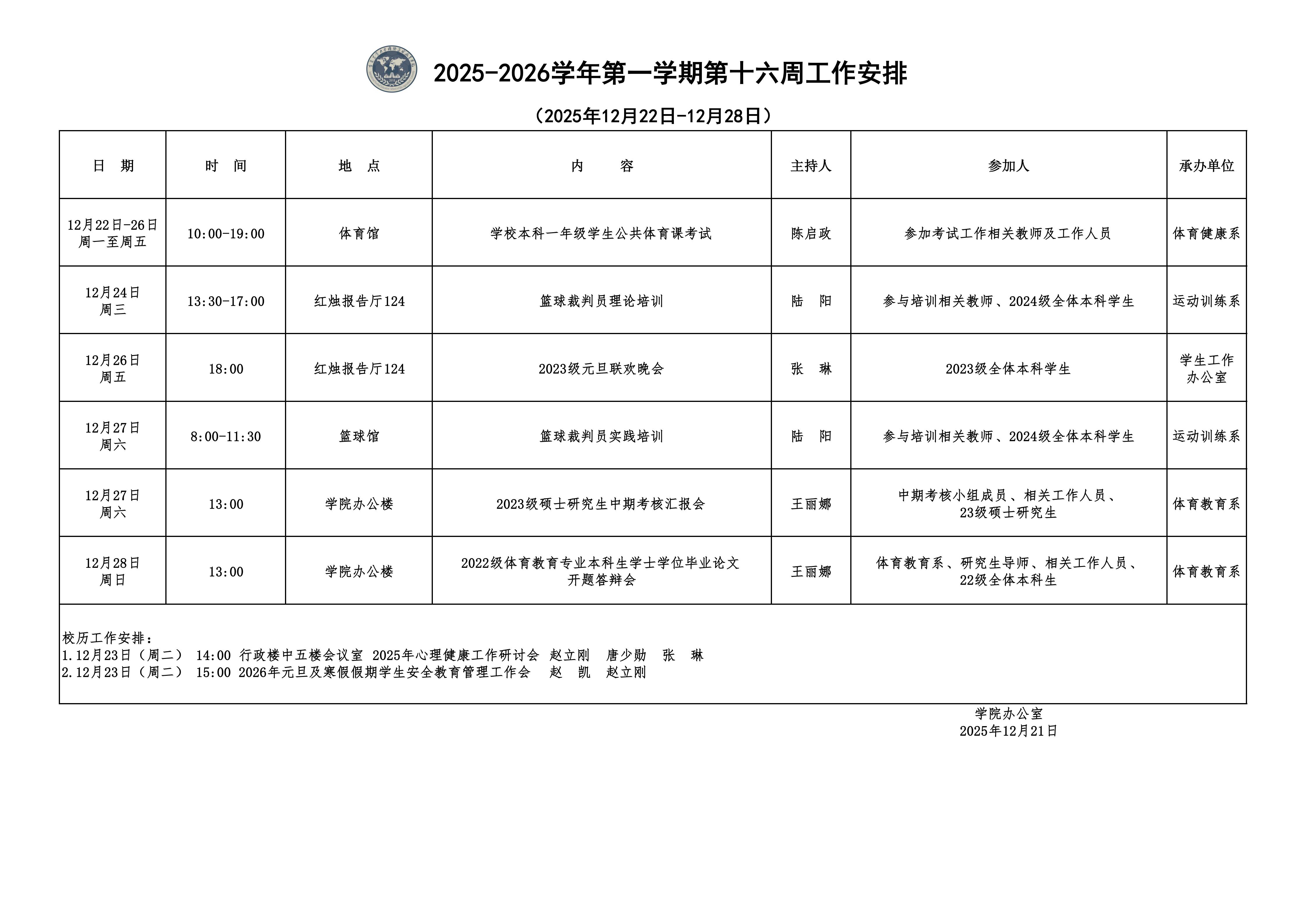 2025-2026学年第一学期第十六周工作安排
